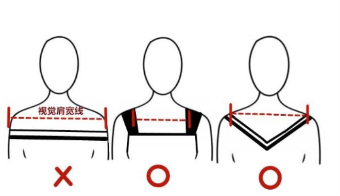 上张对比图中可以看出,左边两图在锁骨处开以V口、右边肩膀处加以背带,阻隔了视觉的横向延伸,显得肩膀娇小,不会显得那么突兀。
