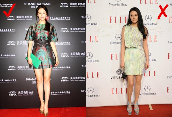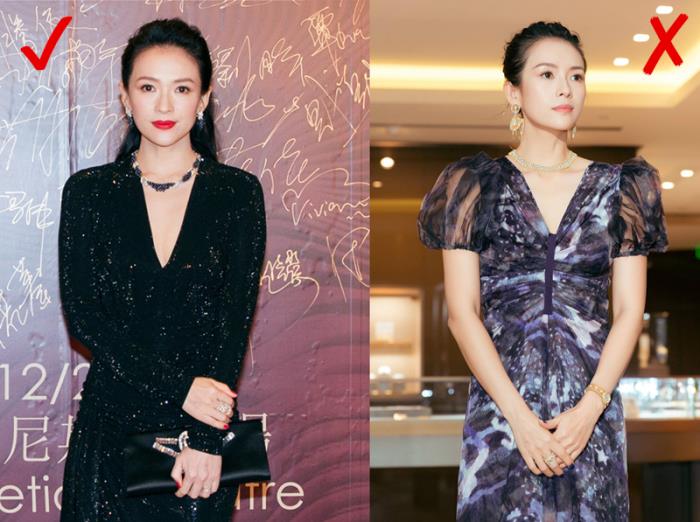 ▲章子怡是头小肩宽的美女,总得来说她是蛮会穿的,不容易察觉她是宽肩星人。她穿V领的礼服超有女神范,尤其是深V领很有收肩的作用,加上收腰的设计大摆的裙摆,轻松呈现S型。