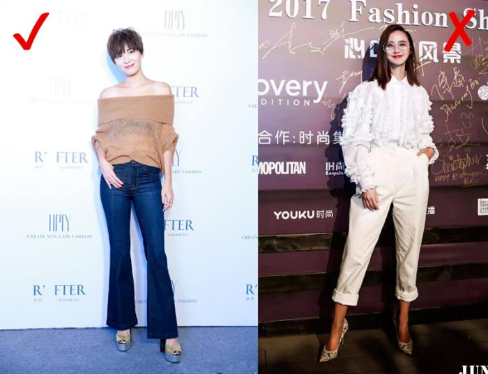 ▲性感的露肩装很多都会在肩部有一些些小小的修饰,下半身搭配了喇叭牛仔裤,巧妙化解你宽肩的缺陷。