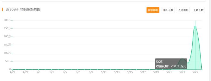 以武汉旺仔的礼物趋势图为例,他们的共同点是营收峰值当天飙升一两百万,且通常是出现在连续的两个直播天数中,而这其中各自直播间神豪的力捧是主要原因。