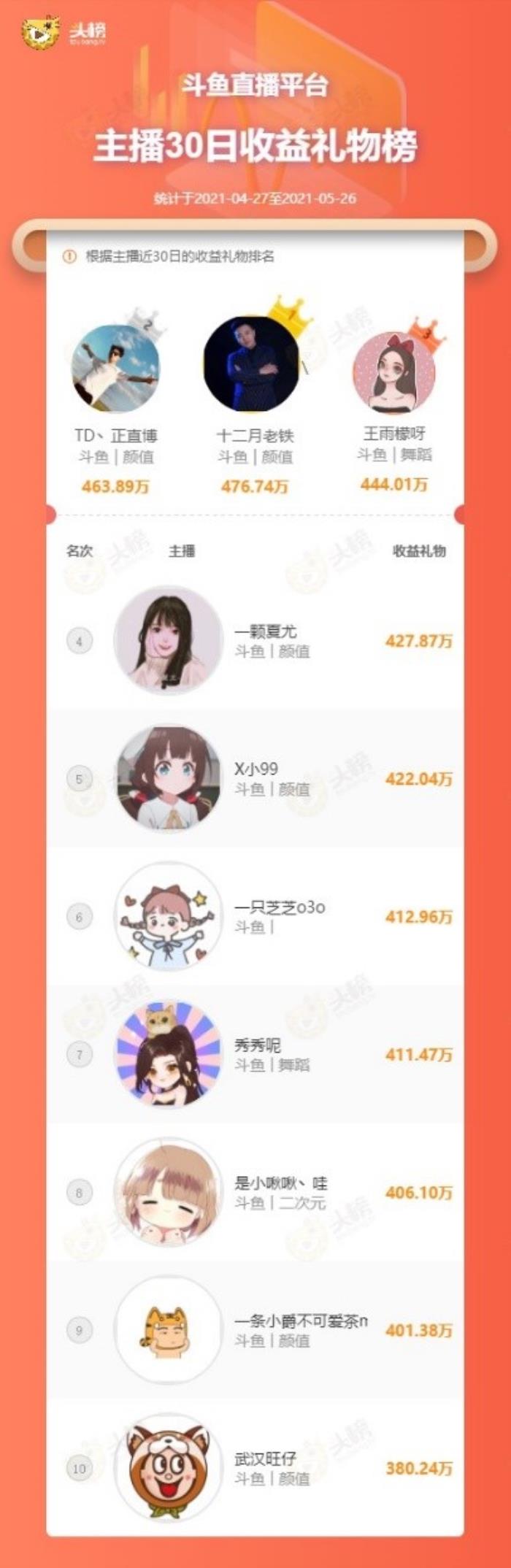 对比营收排行在前三名的平台收入TOP10,斗鱼平台整体金额偏低,呈现出差距小,竞争激烈程度高的局面。第一名与第十名的金额差距不到一百万元,上榜区间从380万-480万,依旧以泛娱乐分区主播入围为主,颜值区更成为主要火力输出点。