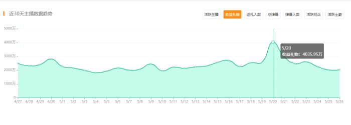 四月末到五月末,近三十天的周期内斗鱼平台在渡过四月份的粉丝节活动后,短期内并未再推出大型平台活动,给了主播们足够的时间休整旗鼓。但即便如此,期间对比几大平台(除去抖音)斗鱼依旧以7亿元的直播营收排行第四位,收入峰值出现在“520”这个比较有节日意义的当天。