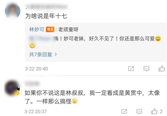 林妙可的父亲林晖看起来精神大好,甚至做起了鬼脸,林妙可也在评论下方称自己父亲为老顽童。更有网友发言说父亲林晖神似黄贯中,两人搞怪的样子如出一辙。