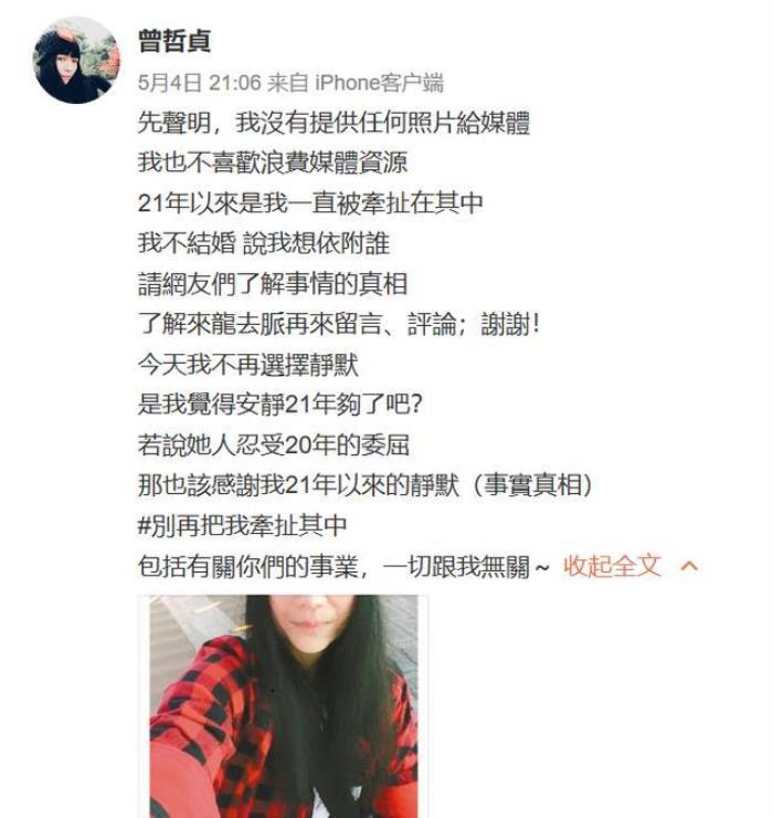 其实早在去年5月,曾哲贞就在微博谈过一次不想再跟前夫有任何关联。当时她接连发两条微博,并声明,这21年以来,对方所发的任何新闻,一切都与自己无关。