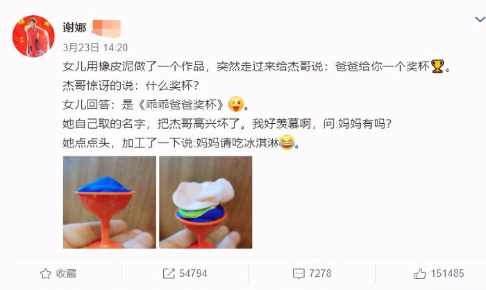 3月23日,谢娜在个人账号上分享女儿的橡皮泥作品,并称道是女儿送给张杰的《乖乖爸爸奖杯》,后还说道因自己羡慕于是也问女儿要,没想到女儿只是简单加工,令人哭笑不得,文字虽简单但是也可以感受到其中蕴含的满满温馨。