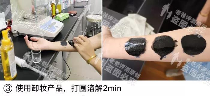 卸淡妆差异不大,遇到难卸的会怎么样?模拟比较难清洗的睫毛膏、眼线、眉笔等,配制油污渍进行实验。油污渍主要成分是炭黑、石蜡、油酸、油酸甘油酯等,这种油污渍很多化妆品公司内部测试也在使用。