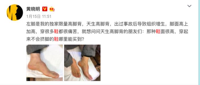 但人们的质疑声并未因此消减。前段时间,在某活动中黄晓明因脚背隆起明显,遭网友质疑称鞋垫太高,把脚背撑到变形。