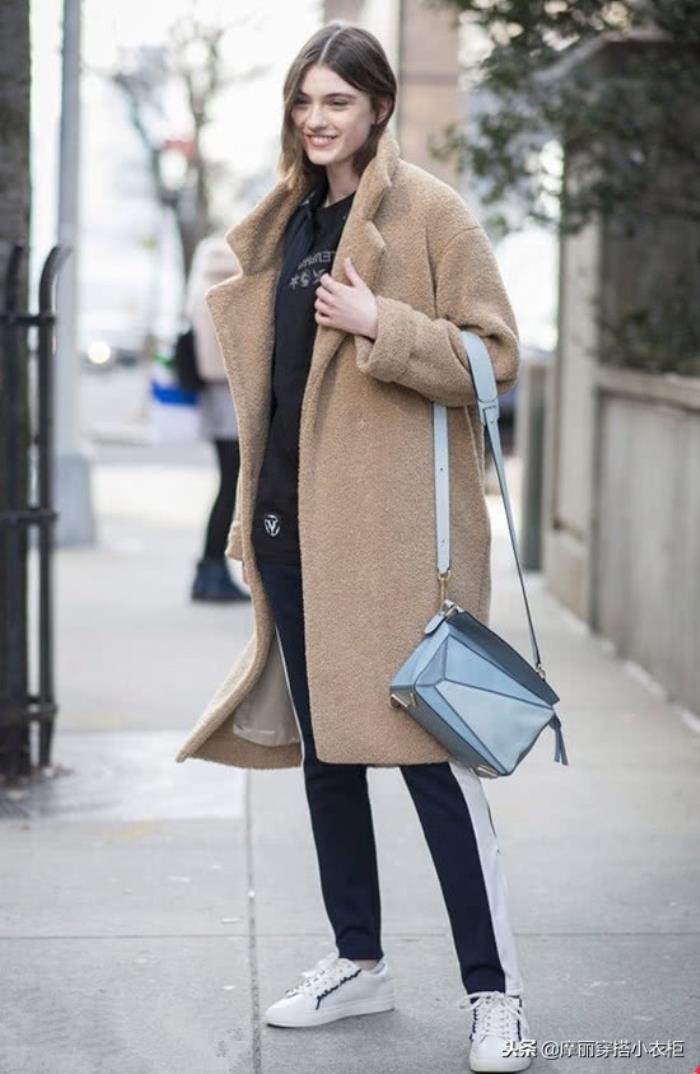 比阔腿裤还潮的黑色运动裤,与白色运动鞋,形成简单的黑白配,演绎街头休闲风。不过黑色运动裤的侧边带有白色条纹的修饰,轻松拉长腿部的长度,显得腿特长。上衣是高级驼色的毛绒外套,显得温暖又可爱。加上极具设计感的蓝色包包,凸显出清爽十足的气质。