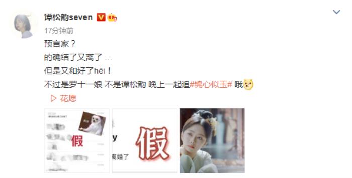 随着事情的不断发酵,3月15日下午,谭松韵也在个人的社交平台上发文对此作出了辟谣澄清:“预言家?的确结了又离了 …但是又和好了hēi!不过是罗十一娘 不是谭松韵 晚上一起追《锦心似玉》哦”。