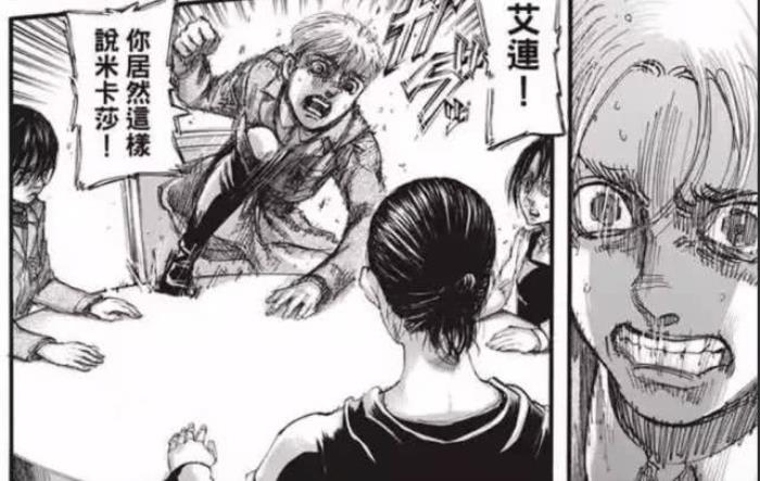 黑化艾伦在这段时间所展现出来的气魄是当初埃尔文团长所拥有的,为了最终的胜利,即便是将自身变成恶魔,他也在所不惜。于是他一直以来都独自一人行动,为了不连累利威尔班的同伴,他刻意疏远他们,就连曾经的青梅竹马三人组,他也故意与之发生矛盾,很大程度上就是为了保护他们。