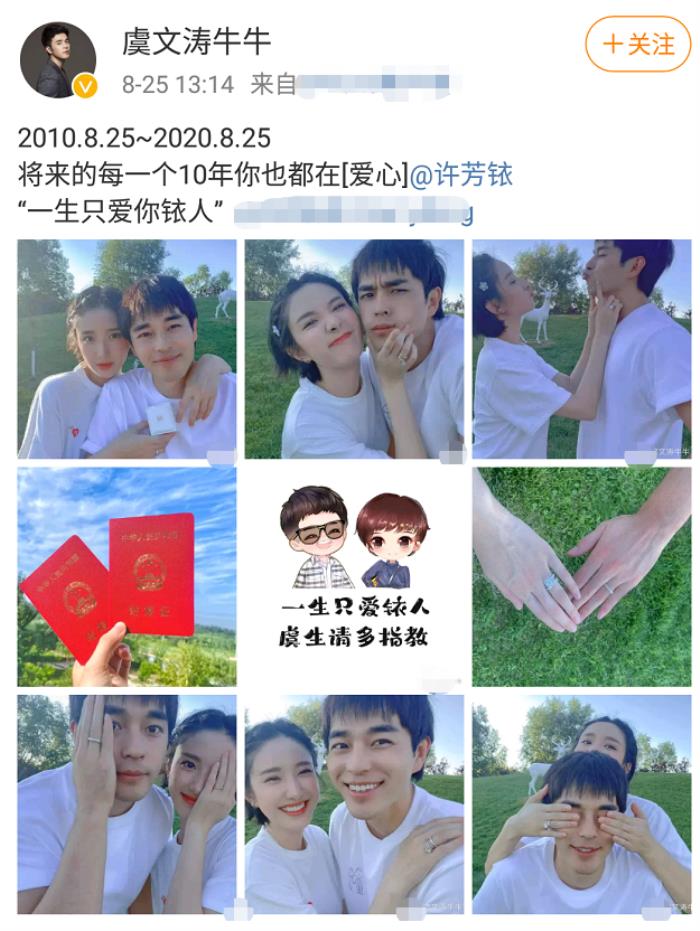 8月25号的13点14分,曾出演《三生三世十里桃花》的演员虞文涛发文官宣喜讯,他与演员许芳铱结束10年爱情长跑,终于结婚了。