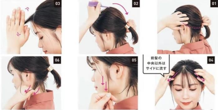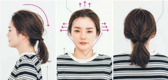 首先重新分缝,按3:7分开并且保证一侧刘海的长度,最大限度对额头颧骨进行修饰。其次,模糊分缝线遮掩头皮。同样扎头发,有足够多的刘海修饰时,五官的缺点不会太明显。