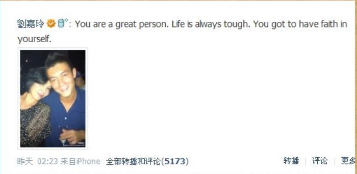 在2011年,在陈冠希丑闻被曝光之后, 刘嘉玲在社交平台上发表过与陈冠希的合照并表示力挺陈冠希,并说道:你是一个很棒的人,生活总是艰苦的,你要对自己有信心 在陈冠希丑闻被曝光之后,刘嘉玲力挺陈冠希并说道,“我看着他长大,眼见他有难,作为长辈,怎么都要伸出援手”,两人曾合作过多部电影,第一次是2003年,陈冠希当时23岁,刘嘉玲38岁,两人相差15岁,并同为香港演员。