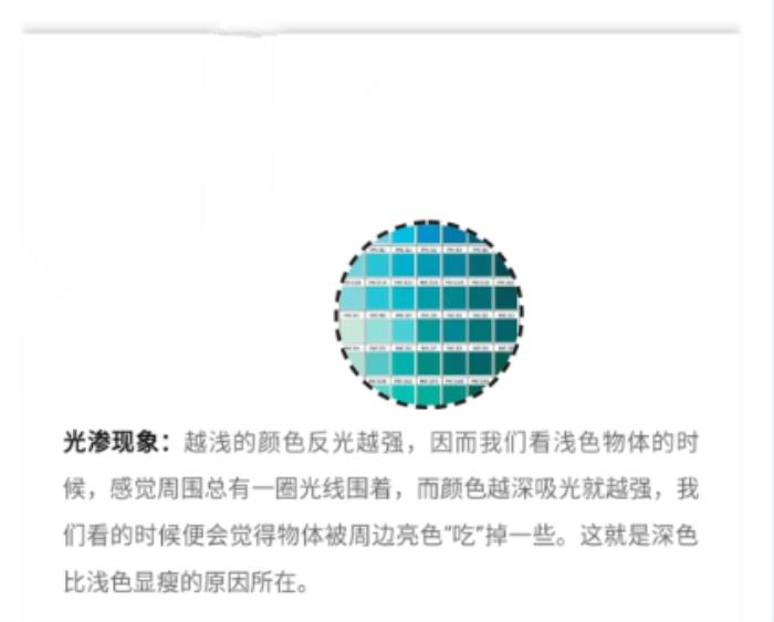 光渗现象:越浅的颜色反光越强,所以当我们看到浅色物体的时候,就会感觉周围总有一圈光线围着。