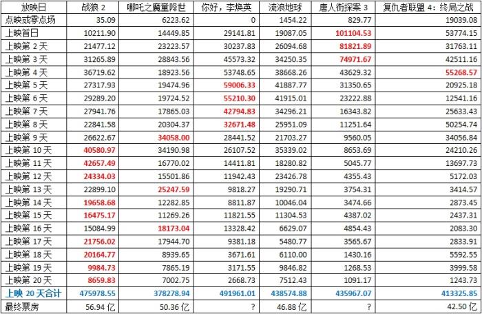 2019年,4部:《哪吒之魔童降世》、《流浪地球》、《复仇者联盟4:终局之战》、《我和我的祖国》