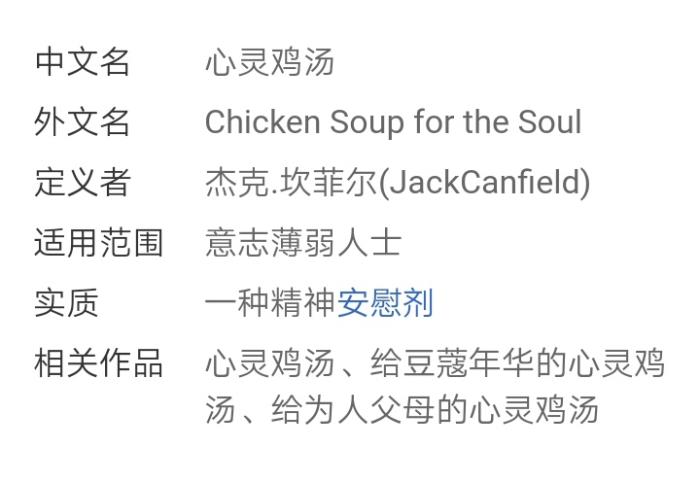 于是,中国式心灵鸡汤应运而生。那些追捧心灵鸡汤的人中,十个里面可能有九个没读过杰克·坎菲尔德的心灵鸡汤,但他们每个人肯定都认为中国人的心灵鸡汤才是正宗的心灵鸡汤,外国货都是糟粕。