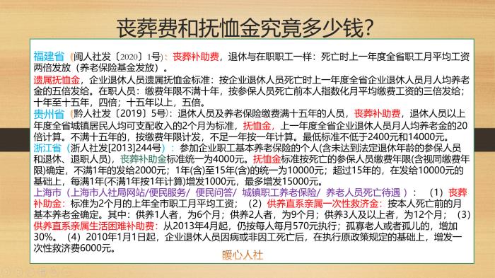 近年来,各个省市也陆续出台了丧葬补助费和抚恤金的待遇标准,相应的负担主体转由养老保险基金承担。比如说福建省明确丧葬补助费为两个月的死亡时上年度全省职工月平均工资,而一次性抚恤金的标准为死亡时上一年度全省企业退休人员月人均养老金的五倍,2019年福建省企业职工退休人员平均养老金为2644元,因此2020年抚恤金的标准为13220元。社平工资的标准为6699元,丧葬补助费标准为13398元。