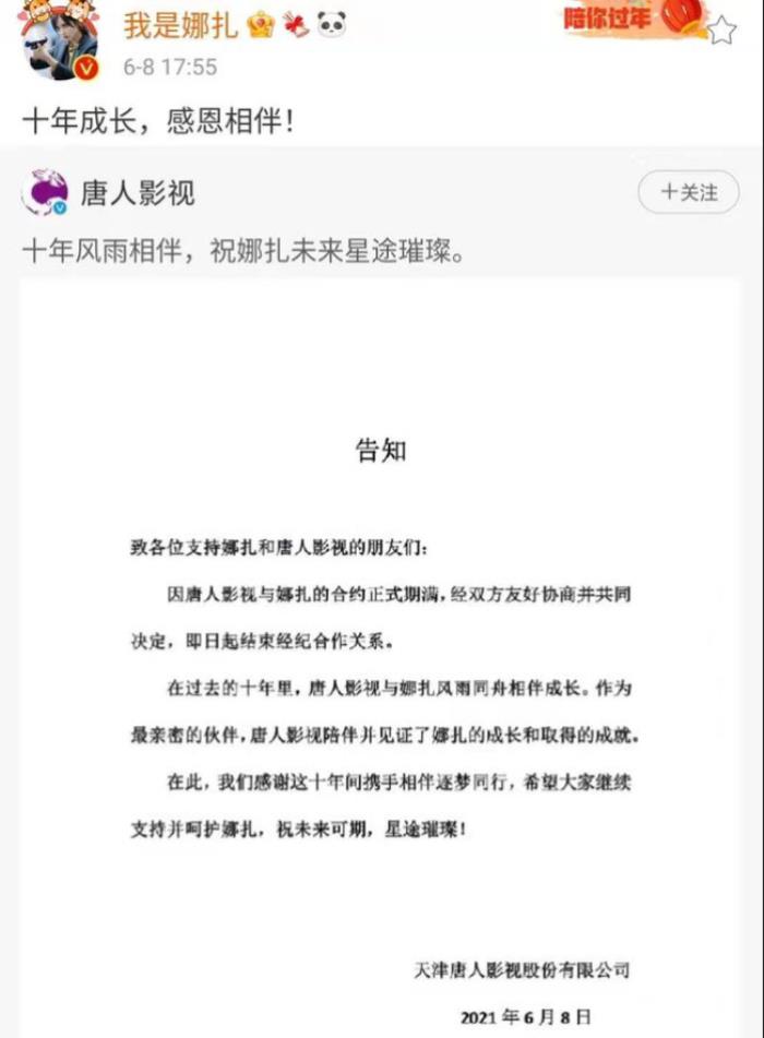 8日晚,古力娜扎在微博发出“十年成长,感恩相伴”,唐人影视的官方微博也回应,“祝娜扎未来星途璀璨”。虽然充满着祝福和体面,但也无法回避双方分道扬镳的事实。