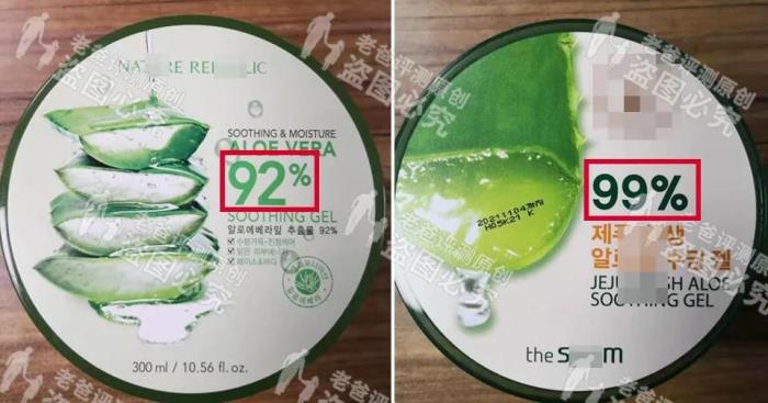 以上面 2 款韩国非常火的芦荟胶产品为例。它们盖子上分别标注了 92% 和 99%。