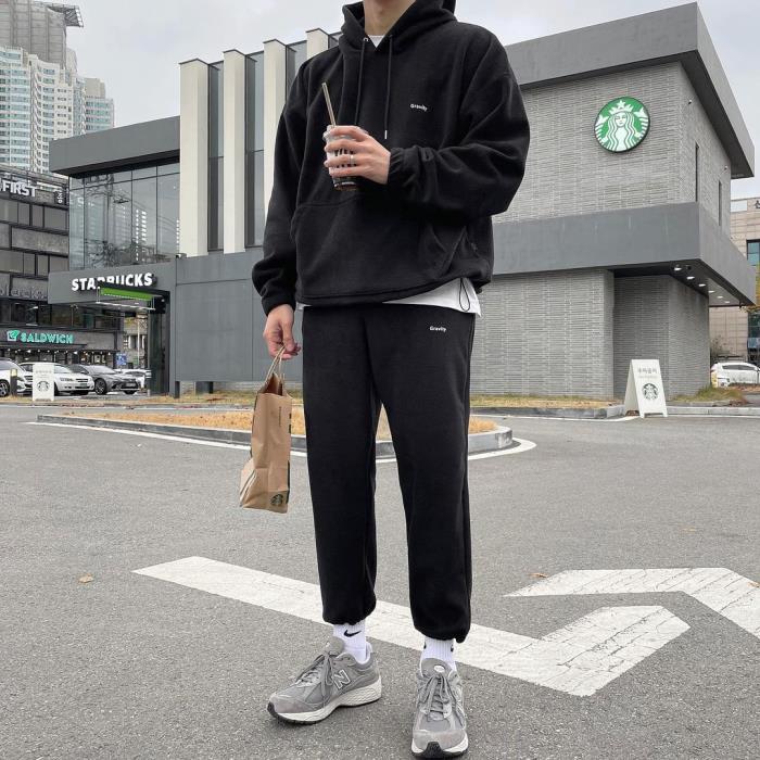大部分男生喜欢的衣服颜色,估计都是黑色吧。黑色的基础款卫衣是最百搭的,适合每一个男孩子。里面搭配一件白色的T恤,衣角稍稍露出,可以打造一种时髦的层次感。裤子则选择黑色的束脚裤,显得特别干脆利落。我们可以穿一双高筒袜塞住裤脚,可以在视觉上拉长自己的小腿,让自己看起来更显高。灰色的经典NB休闲鞋,则能让你看起来更有时尚感。