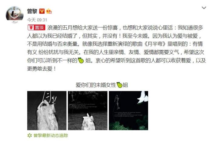 在文中,曾黎表示“浪漫的五月想给大家送一份惊喜,也想和大家说说心里话:我知道很多人都以为我已经结婚了,但其实,并没有!我至今未婚。因为我认为爱与被爱,不是用结婚与否来衡量。在我的人生里亲情、友情、爱情都需要义气”。