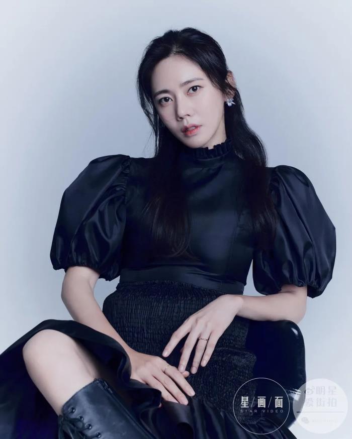 秋瓷炫穿着一袭黑色长裙,搭配黑色皮靴,她俏脸清纯,秀发飘逸,单手撩着自己的下巴,小露白皙的大美腿,美得让人移不开眼。