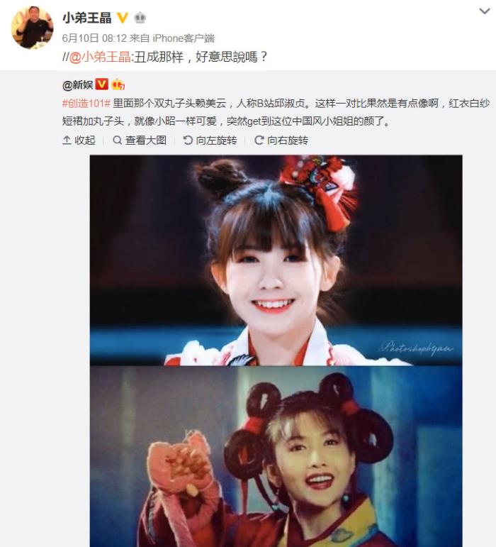 去年有人发了一张《创造101》选手赖美云的照片,说她长得跟邱淑贞很像,结果被王晶看到了,他非常气愤地转发回应说:丑成那样,好意思说吗?之后,又非常生气地再发了一次。意思就是,我王晶的女神哪里是你们这些丑八怪可以比的。