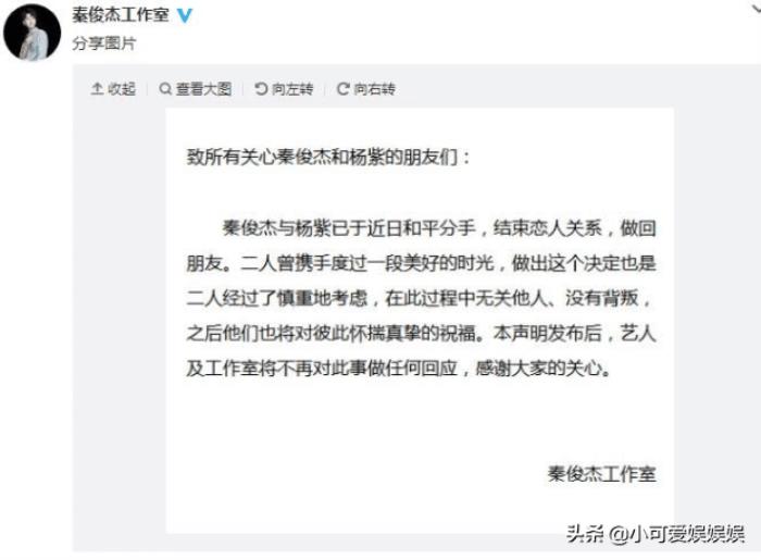 虽然很多人说秦俊杰是因为杨紫的恋情曝光所以才在娱乐圈大火,才让这么多人注意到这个不为人知的小演员,但是好景不长,2018年8月12日,杨紫和秦俊杰工作室先后发布声明,宣布两人已和平分手,结束恋人关系,做回了朋友。