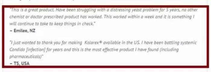 “我只想感谢Kolorex,多年来我一直全身心与真菌感染做斗争,这是我发现的最有效的产品(包括药品)。”--TS,来自美国