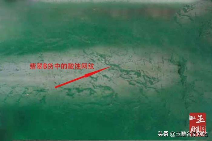 首今天我们先来看一看B货翡翠的真假是如何识别的吧,B货翡翠是将一些表面有杂色的翡翠采用强酸酸洗的方式来“洗”掉翡翠表面的杂色或其他的矿物质,被酸洗之后的翡翠表面会留下一些凹坑,这时则需要充上一层胶质物来掩盖凹坑,这样的B货翡翠和天然的翡翠有着很大的区别。
