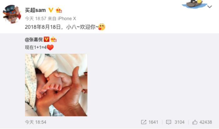 随后,张嘉倪老公买超转发微博并公布儿子乳名叫“小八”,“小OK”有弟弟啦!