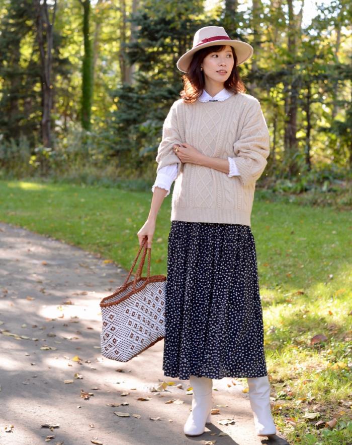 同一件藏蓝色小碎花连衣裙,还可以一衣多穿,把上图的大地色休闲西装外套换成米色的扭花针织圆领套头毛衣,内搭带花边的白色衬衫,又变成一种自然休闲的风格。短靴换成了白色,和米色毛衣和白衬衫上下呼应,整体更显轻盈。▼