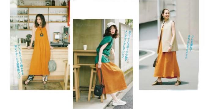 在搭配示范中,洛薇分别以一衣多搭和叠穿来演示。以一件橘黄色吊带裙为例,它的百变风格如下: