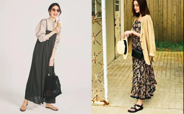 吊带裙穿的就是一份清凉透气,如果不喜欢露肩,可以叠穿各类T恤巧妙过度化解。想要优雅大方,选择米色背心,与肤色天然融为一体,突出黑色的朴素大气。