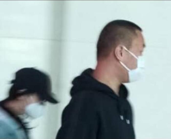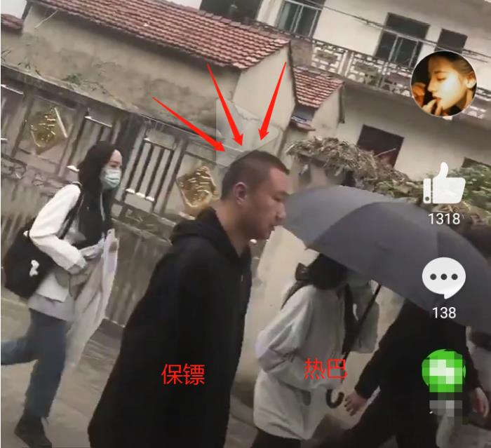 热巴身后有一位身穿黑色短袖的保镖大哥,留着寸头,小眼睛圆脸,身材魁梧。