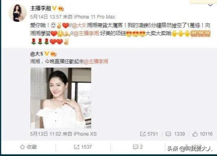 大S就曾夸过李湘,说她带货太厉害,一万条项链5分钟抢空。