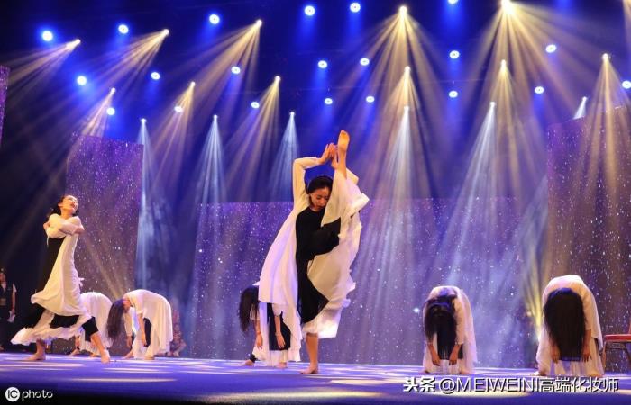 用白色的眼影做底色,这样可以使后面所要用到的颜色更好的融合在一起。接着,在上眼皮,画出眼球的轮廓,且要根据你所穿的演出服装选出适合的颜色,涂满整个你画出的轮廓内部。最好使用强烈的,奔放的色彩,例如:带有光感的黑蓝色。接着在眼球中央的部位,加上炫丽的石榴红。用蓝色在两边稍稍加强即可。用高光粉或者白色眼影,在眼求最高处和眉骨下方轻轻点一些,这样能使眼睛看上去更加明亮。最后刷一点无色闪光的粉或者涂上闪光胶,再用黑色眼影沿着下眼线进行加深即可。