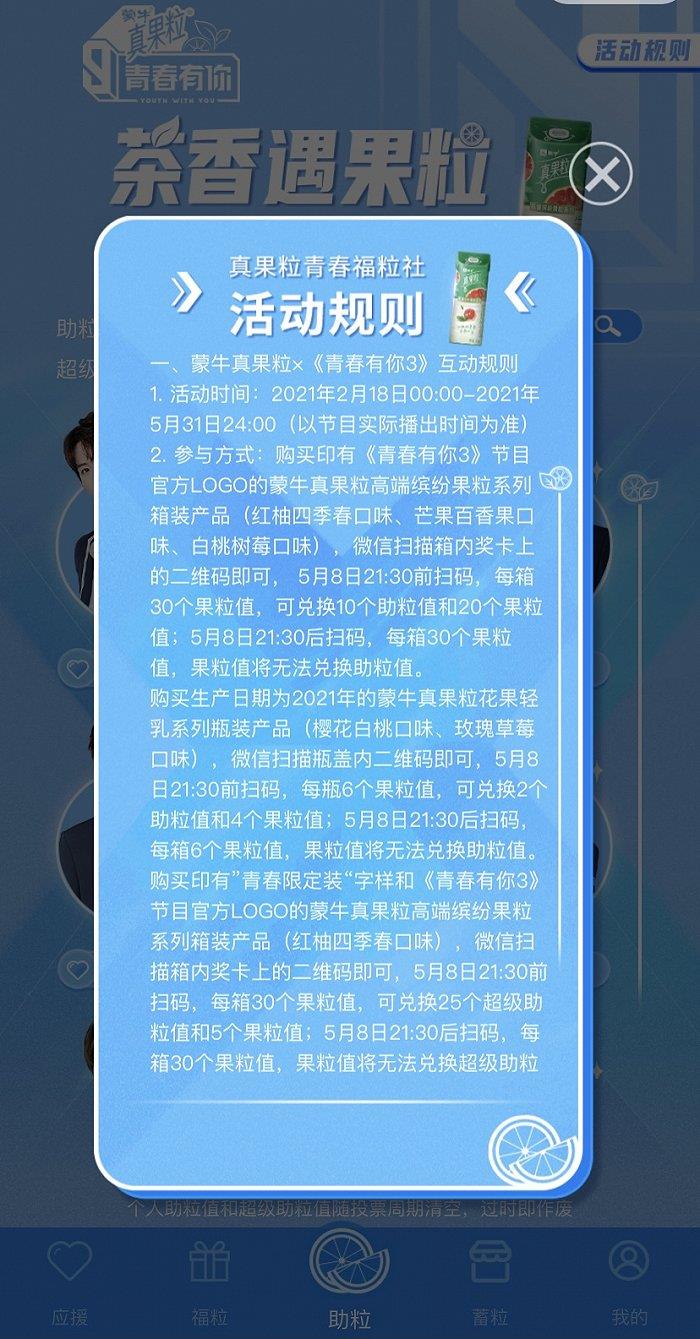 比如,今年《青3》的独家冠名商是蒙牛旗下的真果粒,在爱奇艺直接投票外,还有两种通过买奶获得的投票方式。一种是放在箱子里的奶卡,对应的是真果粒高端缤纷果粒系列,每箱12包,售价为54元,可以获取10个助力值,另一种就是视频中涉及的必须开瓶才能扫码的奶盖,对应的是真果粒花果轻乳系列,每箱10瓶,售价是69.9,每箱20个助力值。
