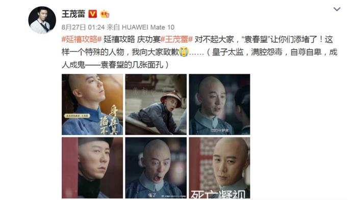 《延禧攻略》中袁春望的饰演者王茂蕾向观众道歉,因为“袁春望”这个角色给观众添了堵。关闭微博评论之后,他自己也留言解答了网友关于太后为什么没杀袁春望的质疑,他说:答案很简单,从宋春丽老师的表演上看得出来,袁春望的确就是雍正的私生子。剧中,乾隆要凌迟处死袁春望时,太后制止乾隆,最后与乾隆那一秒的对视,两个人就立刻心中明了了。
