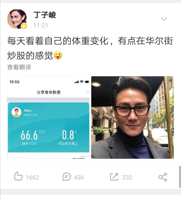 举一个身高掺点水的明星,比如丁子峻,经常会分享他减肥的数据。然而按照这个体重BMI推出来的身高是171(BMI22.8=66.6/1.71²),但是他的百度百科是176。