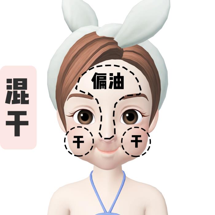 混干皮的特征:额头鼻子会出油,而脸颊反而比较干容易脱皮