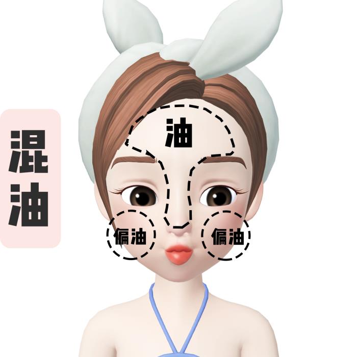 混油皮的特点:额头和鼻子的位置出油比较明显,两颊只能微微看出泛油光,但还在可以接受的范围内
