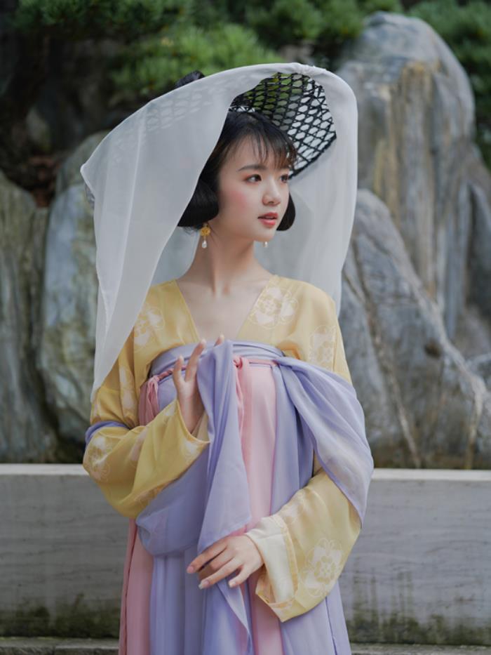 第三款下裙是破裙的汉服就是 鹿鸣溪原创汉服 家的别长安了,这款汉服也非常具有唐朝的韵味。整套汉服的上衫是暖暖的淡黄色,下裙则是清新温柔的粉紫色,看上去就如同邻家温柔的小妹妹一般。