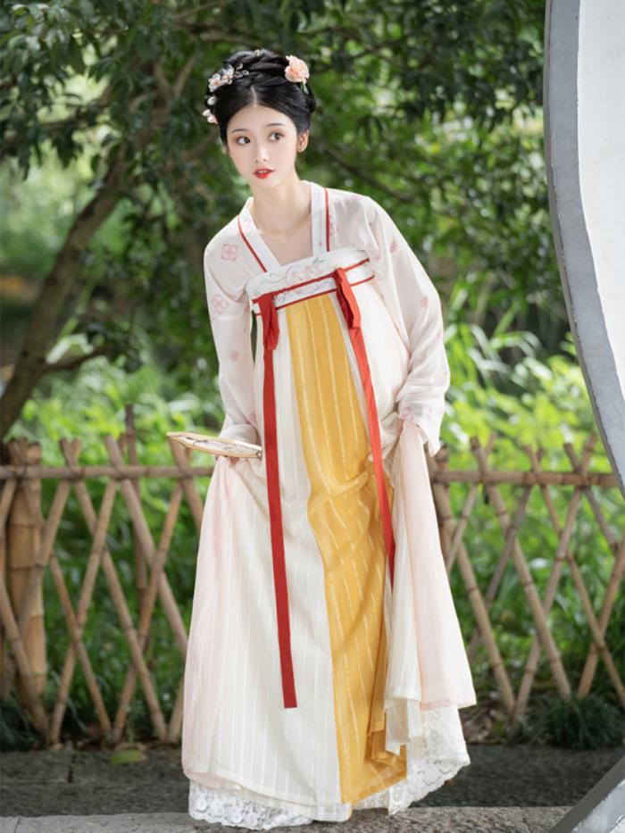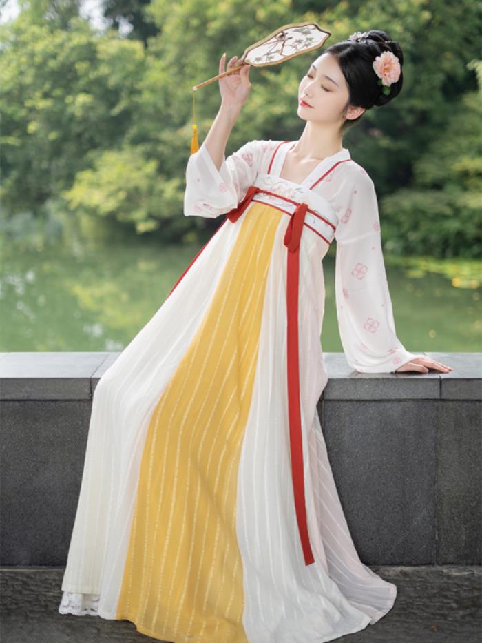 第一款破裙类的齐胸汉服就是 衣锦九都汉服 原衣锦江南汉服馆 家的花汐了,这款汉服的颜色也是比较清新的。裙子的主体颜色是白色,但是在裙子的中央,又有一大片的暖黄色作为点缀,使得整体的风格都活泼了不少呢。当然,由于裙子的主要颜色是白色,所以大家在穿着这类裙子的时候,可能会觉得有些微透哦,最好还是搭配衬裙来穿着啦。