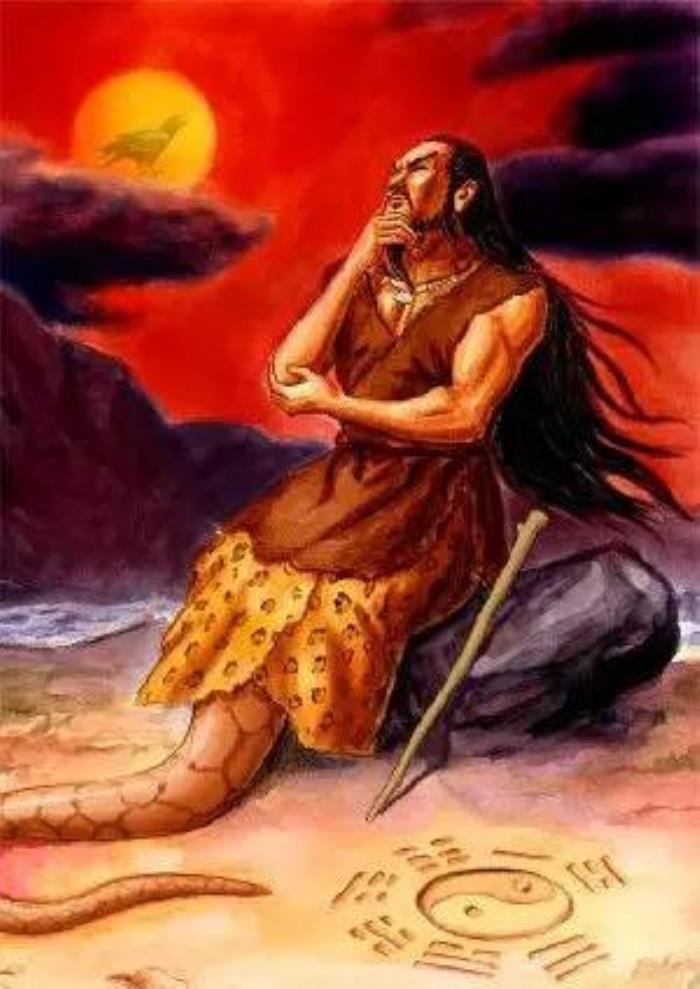 伏羲十分茫然,不知所措。在闲暇之余,时常盘坐卦台山巅,苦思宇宙的奥秘。仰观日月星辰的变化,俯察山川风物的法则,不断地反省自己,追年逐月,风雨无阻。
