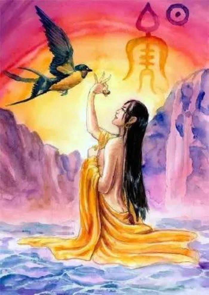 在远古的黄河之滨,一只“玄鸟”唱着歌儿从空中飞来,带给人们无穷无尽的遐想――它是天的使者,原始部落的人们一个个对它顶礼膜拜。一个叫简狄的女人,吞服“玄鸟”下的蛋后,怀孕生下一个儿子叫契。契,即是阏伯,就是传说中的商之始祖。《诗经·商颂·玄鸟》曰:“天命玄鸟,降而生商。”这就是“玄鸟生商”的美丽故事。