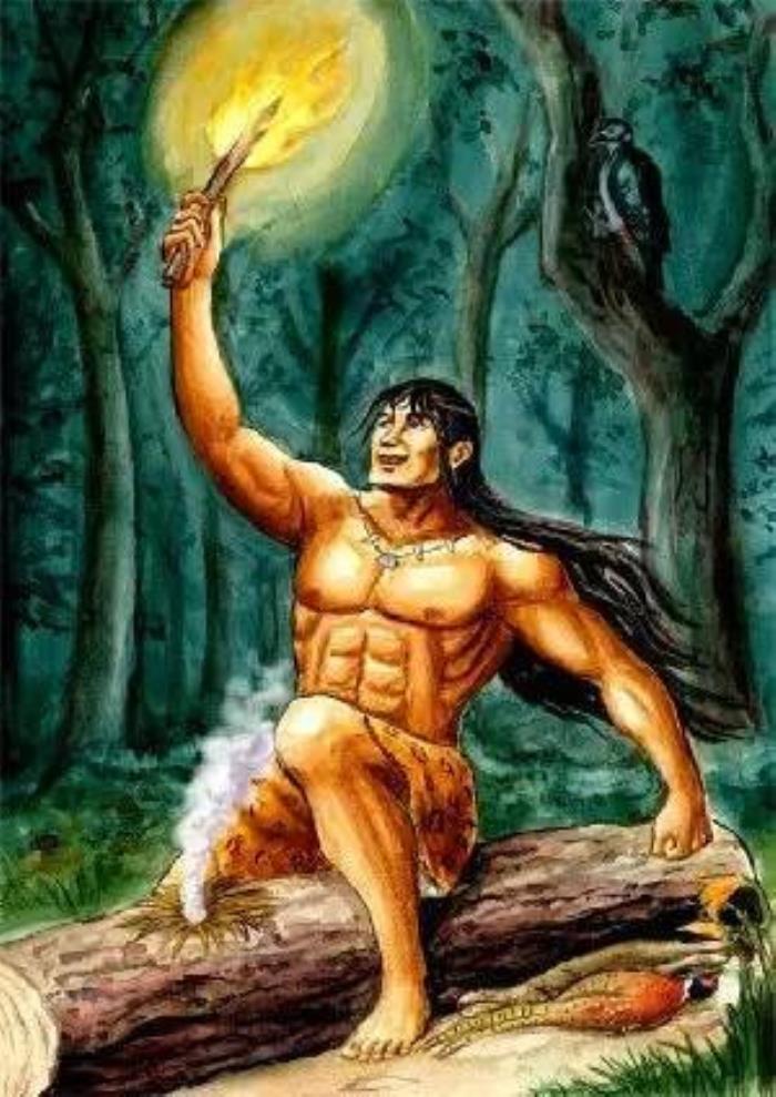“燧人氏”,发明钻木取火的方法。让人们享受到光明,让人们无须生活在黑暗中,他的事迹是对人类最初征服火的一曲颂歌。人征服了火,火磨炼了人,人成了星际间的万物之灵。
