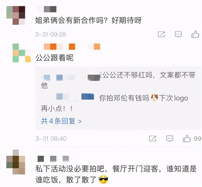网友们在看到胡静与邓伦聚餐的消息后,有人评论道:“私下活动没必要拍吧,餐厅开门迎客,谁知道是谁吃饭,散了散了。”还有人询问:“姐弟俩会有新合作吗?好期待呀。”