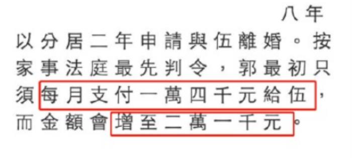 法院判伍智恒胜诉,郭永淳每月支付一万四千港币给她,后来涨到两万一千。