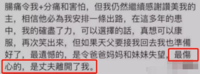 由此可见,婚后伍智恒的病情越来越严重,他们离婚时,她几乎是病入膏肓了。